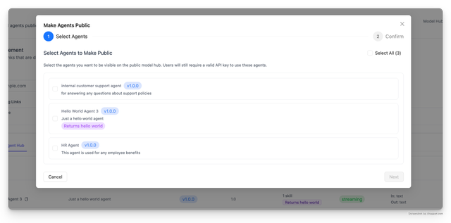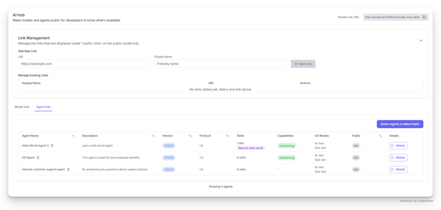Admin can select models/agents to expose on public AI hub → Users go to the public url and see what's available.
